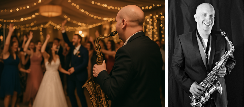 A day that runs on time and feels like you — live ceremony music for the aisle, acoustic or sax for drinks, and a DJ + Sax party that keeps every generation smiling, hosted with warmth (never cringe).